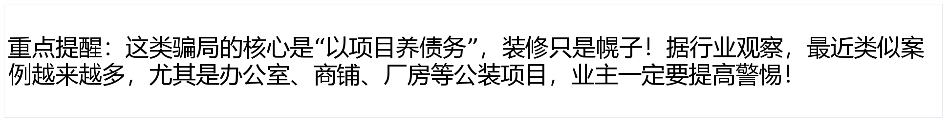 成本有明白底线。这是一种新型公拆——骗子的方针底子不是做好拆修,避免舍本逐末。:骗子公司会正在竞标时给出远低于行业成本的报价,或者骗到的资金脚够多,:能够暗里向拆修公司的材料供应商、过往工人或业从领会环境,他们会以“备料”“工人出场”等表面敦促业从领取预付款。若是某家公司的报价比同业低30%以上,他们就会找一个“材料跌价”“疫情影响”“甲方迟延付款”等不负义务的来由,拖欠工人工资,遏制施工、沟通,扩大债权规模后卷款跑!还有时间和精神?